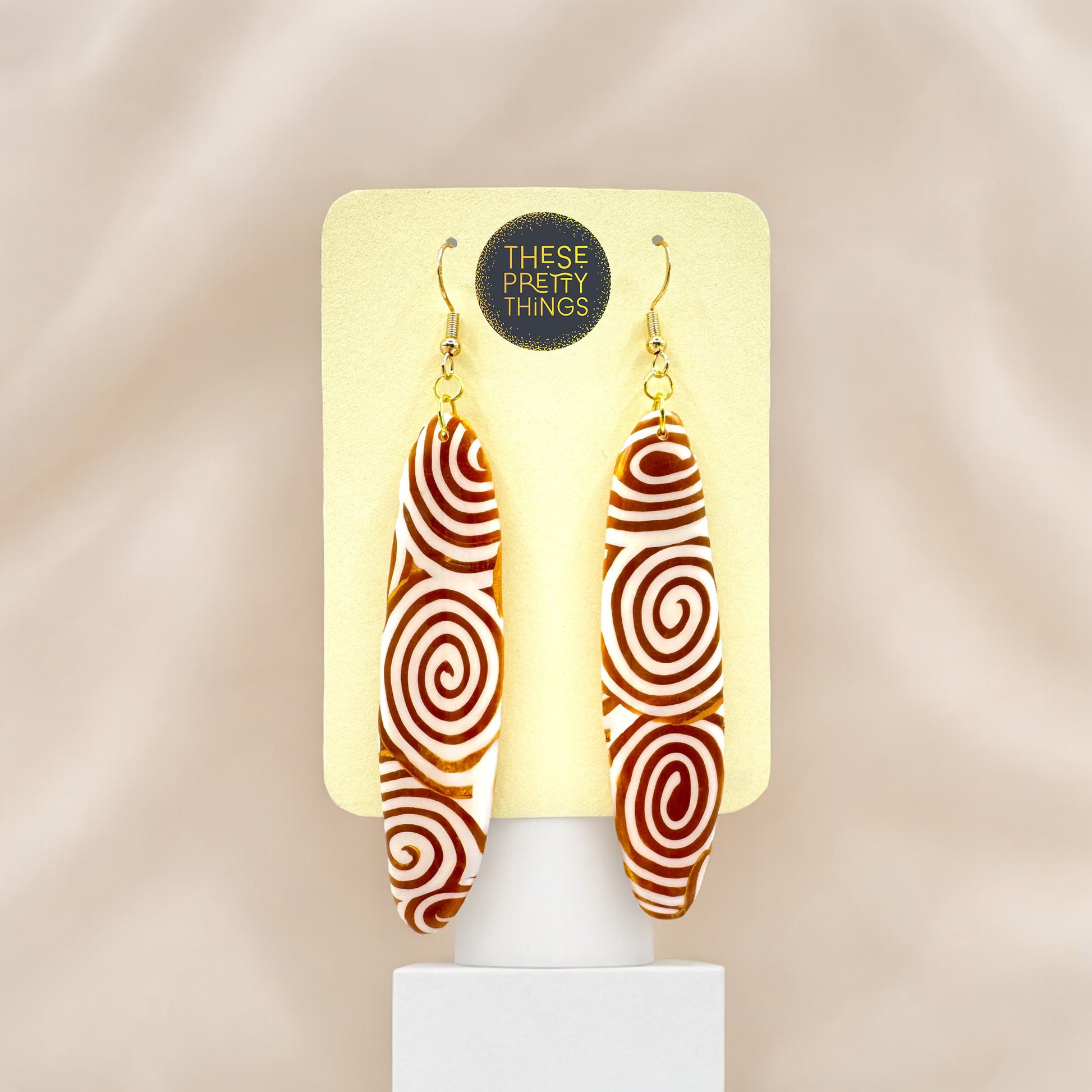Get ready to razzle dazzle with the Aurum Helix Collection. Created and formed by hand with polymer clay, inspiration was taken from the enchanting corkscrew (helix) formations which can be found all around us, from the night sky, flowers, and shells to our very own DNA. Lustrous gold (aurum) alongside rich creamy white shades spiral throughout this mesmerising design where every curve tells its own story. Finished with a high gloss resin and 925 stainless steel gold plated hypoallergenic hooks.