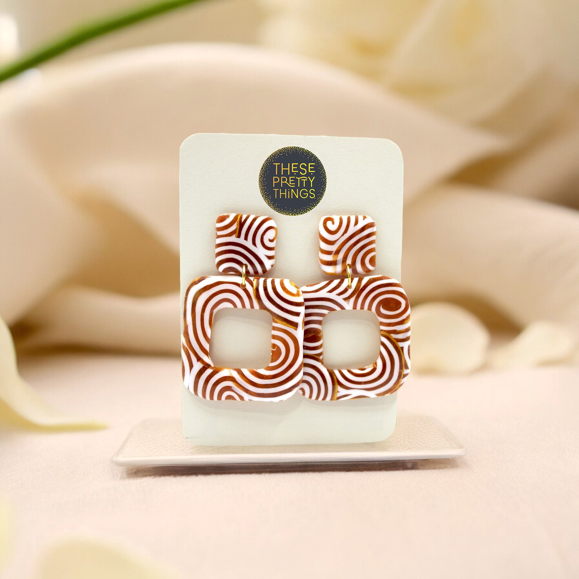 Get ready to razzle dazzle with the Aurum Helix Collection. Created and formed by hand with polymer clay, inspiration was taken from the enchanting corkscrew (helix) formations which can be found all around us, from the night sky, flowers, and shells to our very own DNA. Lustrous gold (aurum) alongside rich creamy white shades spiral throughout this mesmerising design where every curve tells its own story. Finished with a high gloss resin, 304 stainless steel gold plated hypoallergenic earring posts and matching butterfly backs.