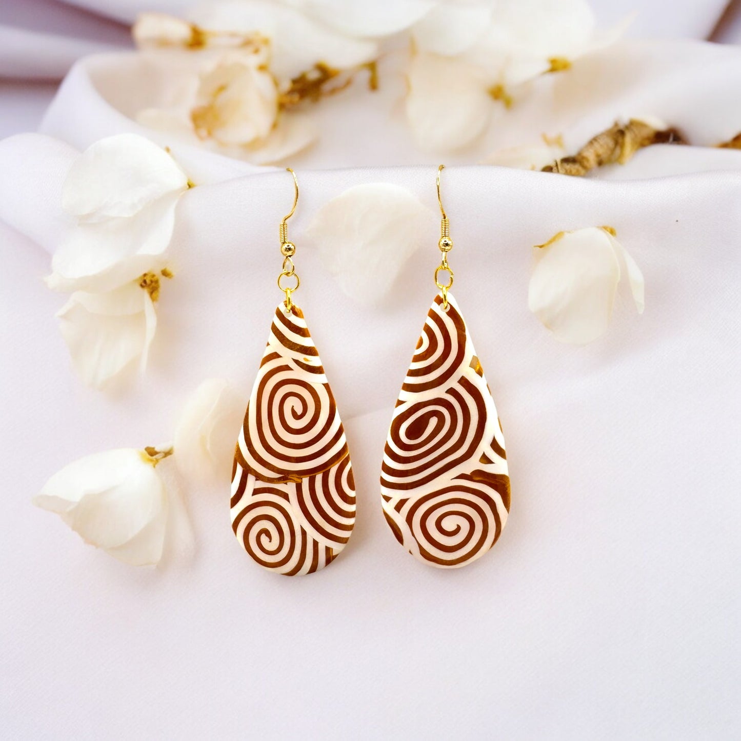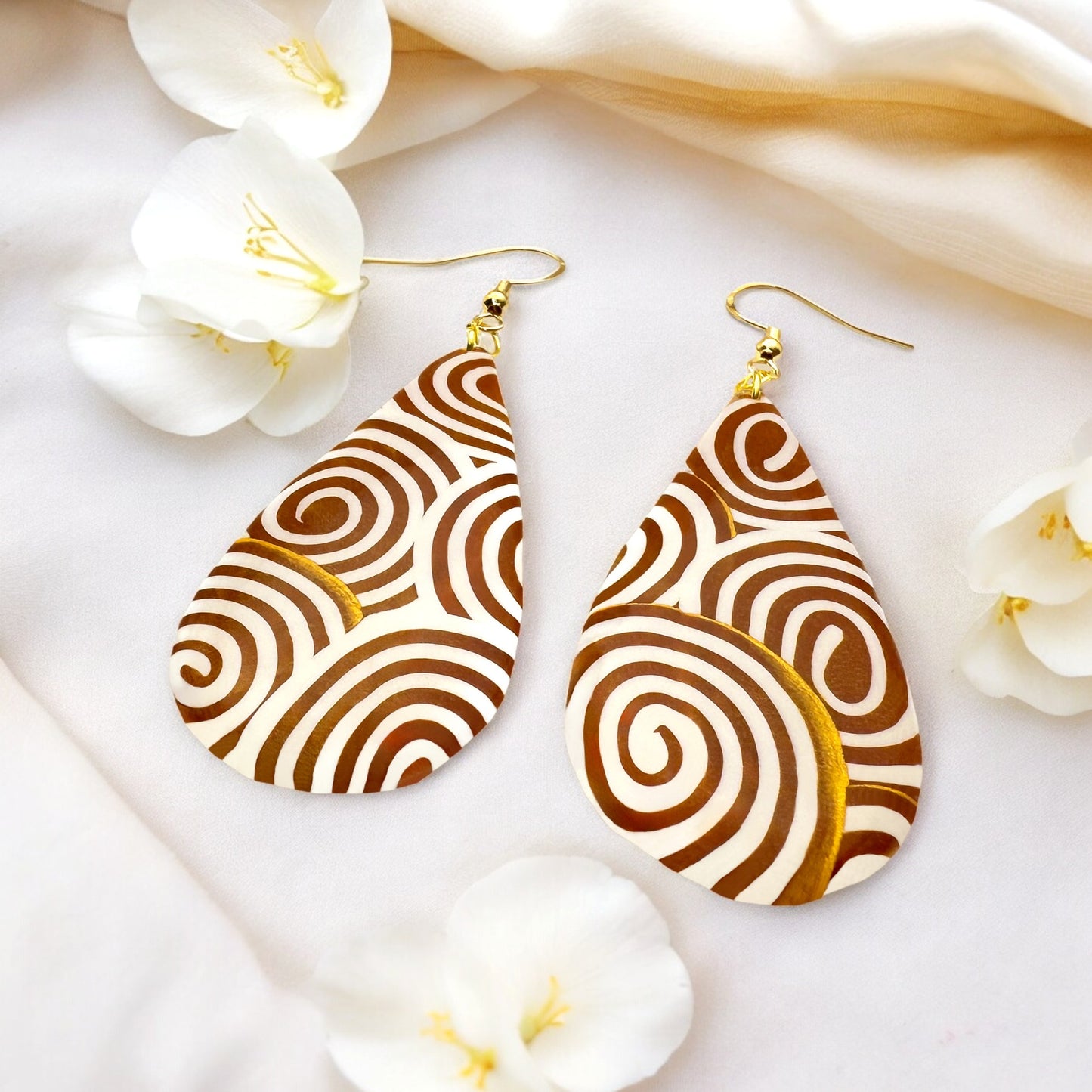 Get ready to razzle dazzle with the Aurum Helix Collection. Created and formed by hand with polymer clay, inspiration was taken from the enchanting corkscrew (helix) formations which can be found all around us, from the night sky, flowers, and shells to our very own DNA. Lustrous gold (aurum) alongside rich creamy white shades spiral throughout this mesmerising design where every curve tells its own story. Finished with a high gloss resin and 925 stainless steel gold plated hypoallergenic hooks.