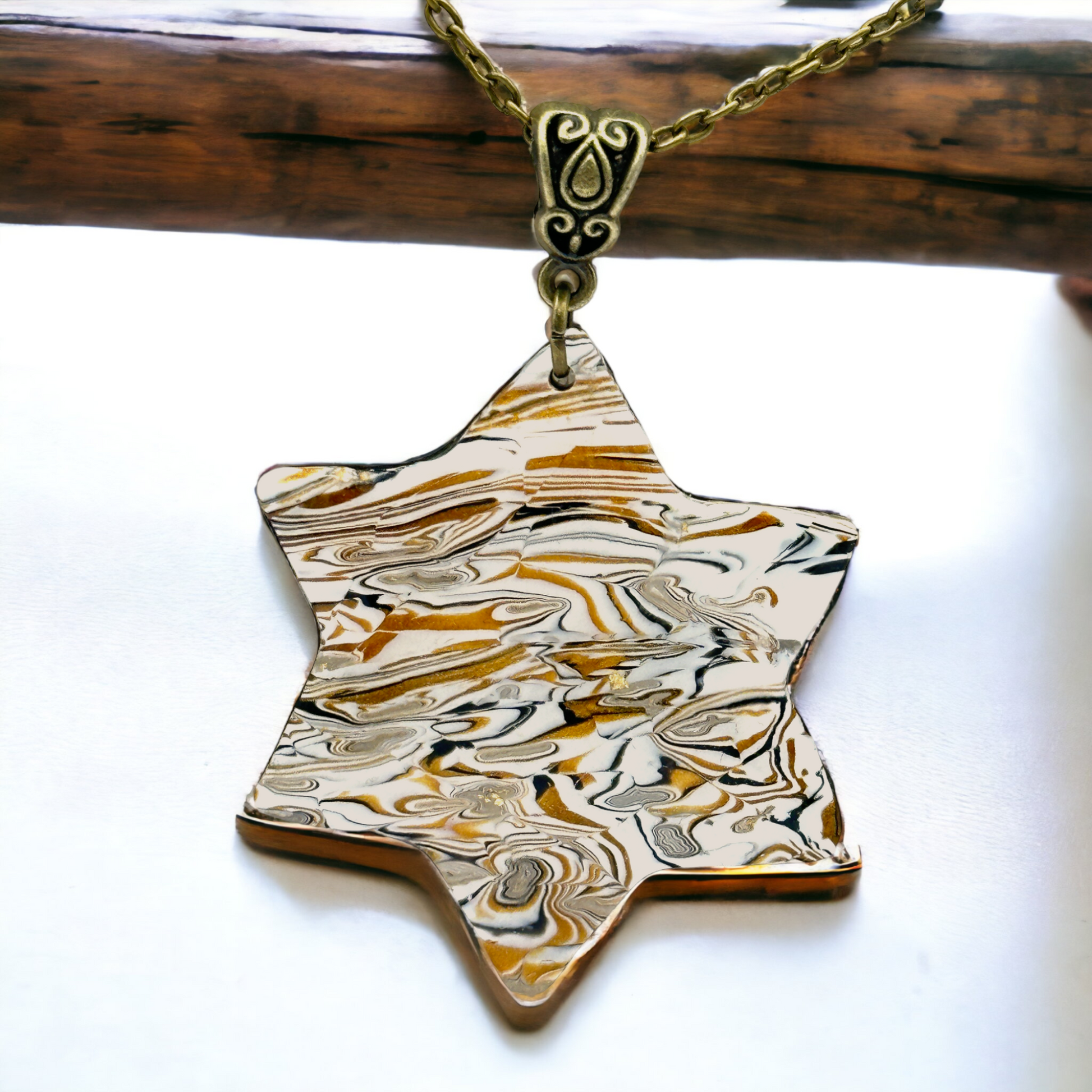 The Azura Star Necklace is an exquisite and eye-catching totally unique limited edition accessory handmade from Polymer Clay that features a vibrant one of a kind Mokume Gane pattern of interlocking shimmering gold, copper, silver, white and black colours with a high gloss resin finish. A beautiful antique bronze patterned bail connects the 18 inch antique bronze coloured chain which features a lobster claw clasp. Wear this stunning piece with confidence to make a sophisticated and visually arresting statement in any setting.