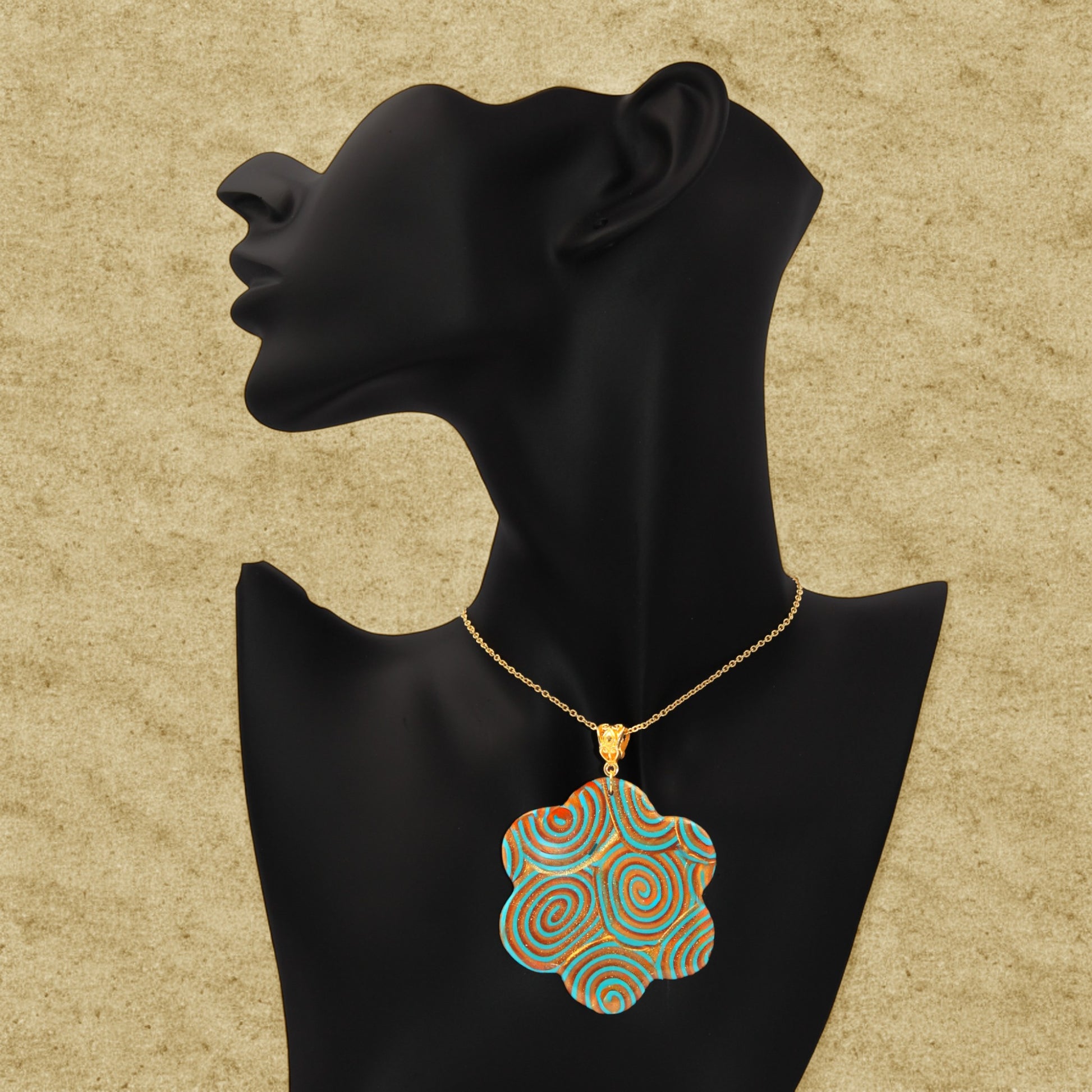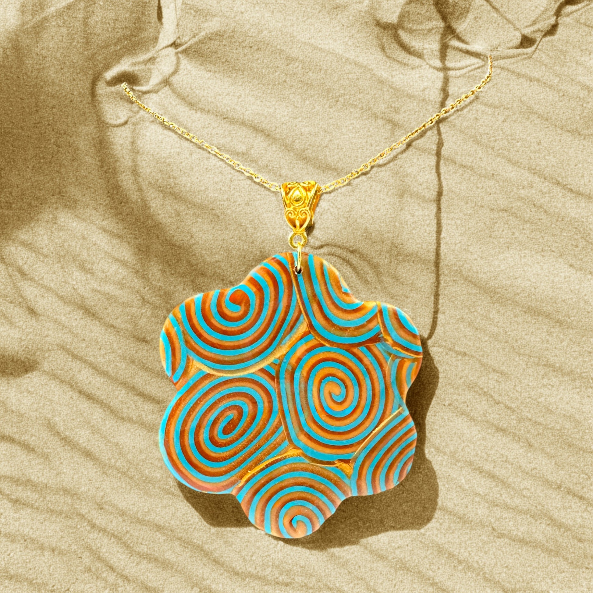 Inspired by ancient Egypt's fascination with symbolism, the Osiris Bella Necklace focuses on the colours associated with the river, sun and heavens. Using a blend of opulent turquoise blue and variations of lustrous gold coloured polymer clay, unique and mesmerising patterns are formed making a captivating piece of wearable art. Finished with high gloss resin, a beautiful gold coloured patterned bail connects the 18 inch gold coloured chain which features a lobster claw clasp.