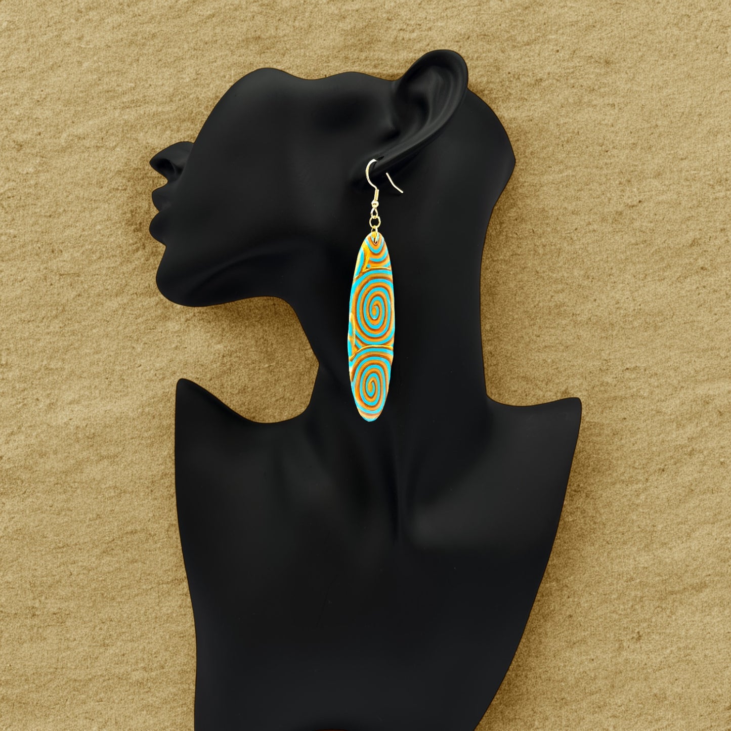 Inspired by ancient Egypt's fascination with symbolism, the Osiris Extra Large Long Oval Earrings focus on the colours associated with the river, sun and heavens. Using a blend of opulent turquoise blue and variations of lustrous gold coloured polymer clay, unique and mesmerising patterns are formed making a captivating piece of wearable art. Finished with a high gloss resin and 925 stainless steel gold plated hypollergenic hooks.