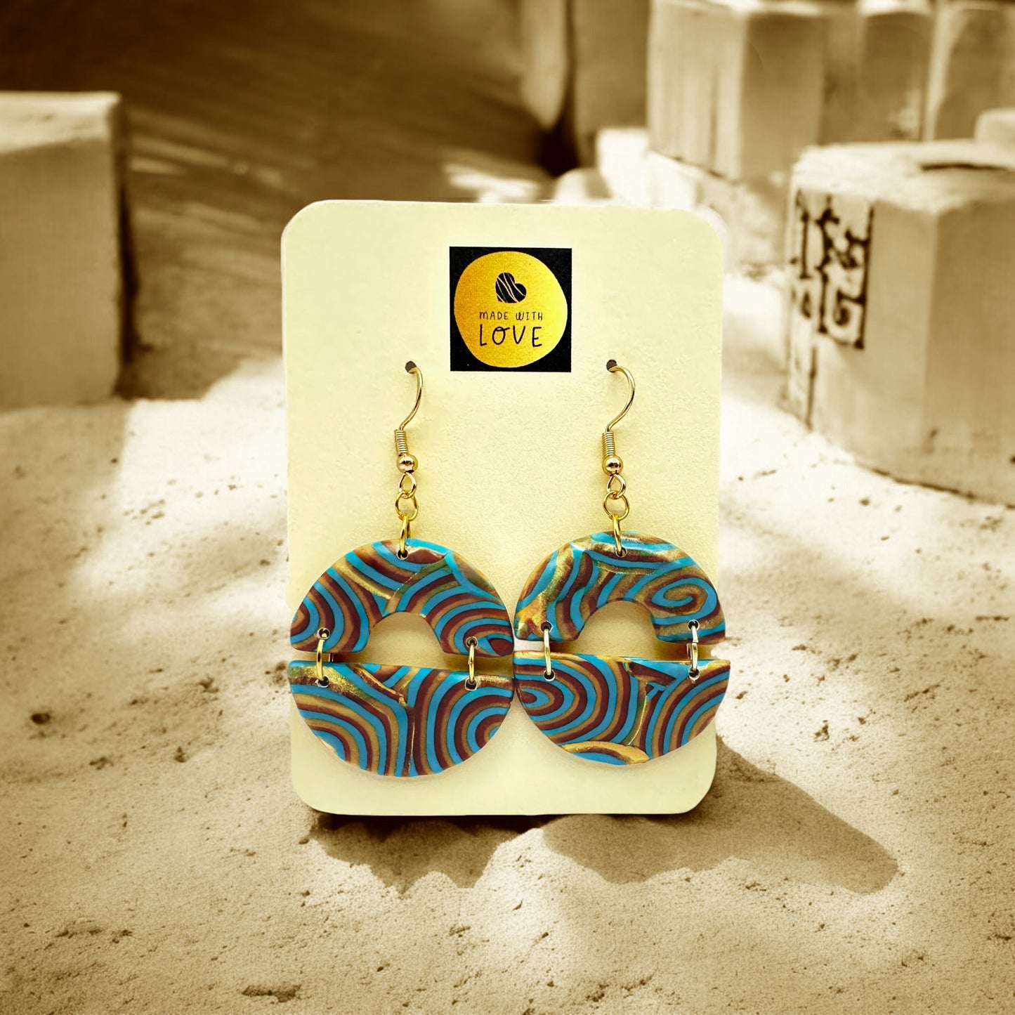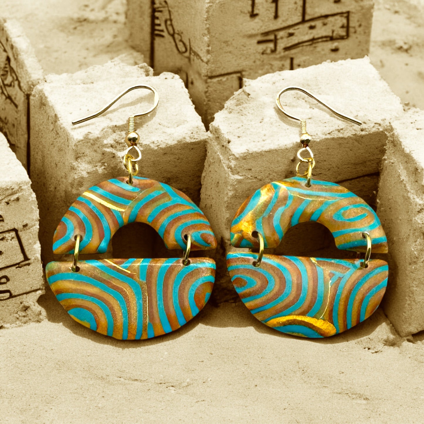 Inspired by ancient Egypt's fascination with symbolism, the Osiris Large Joined Semi Circles Earrings focus on the colours associated with the river, sun and heavens. Using a blend of opulent turquoise blue and variations of lustrous gold coloured polymer clay, unique and mesmerising patterns are formed making a captivating piece of wearable art. Finished with a high gloss resin and 925 stainless steel gold plated hypoallergenic hooks.