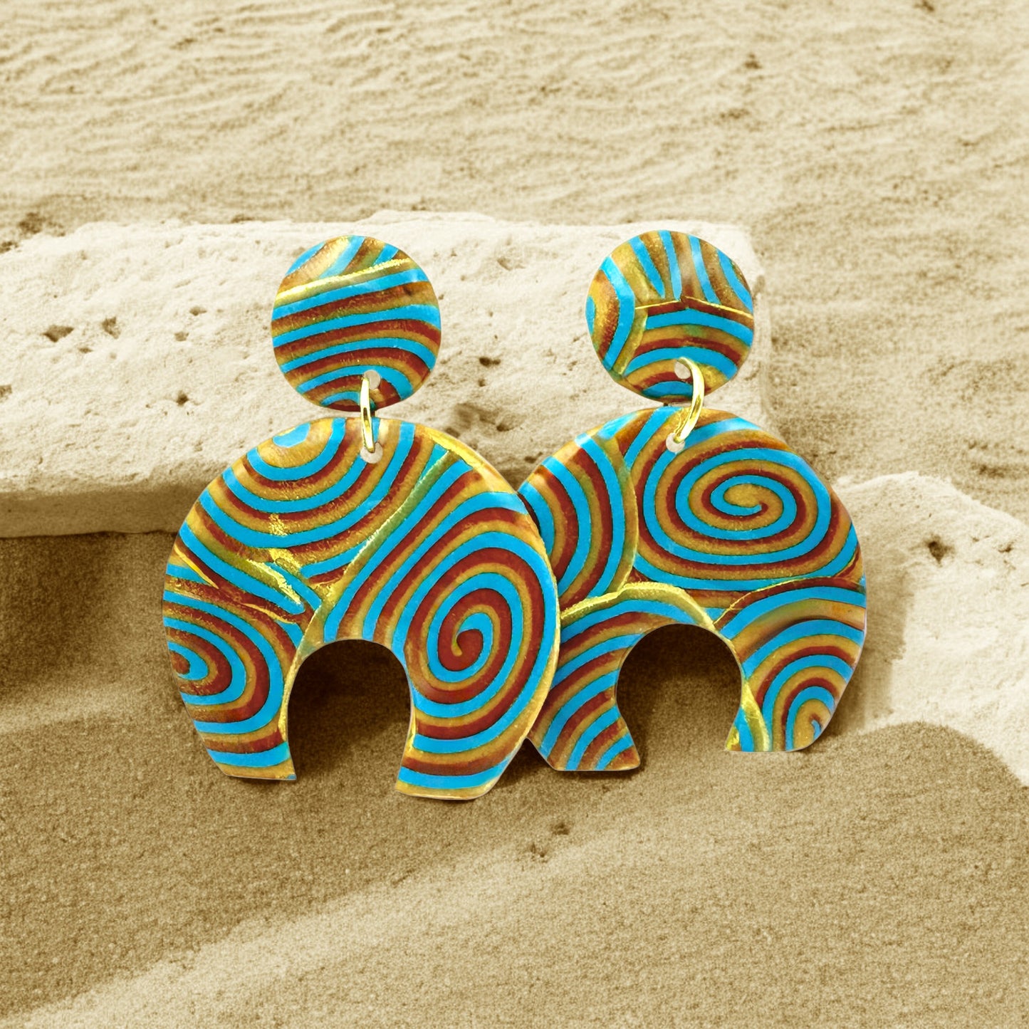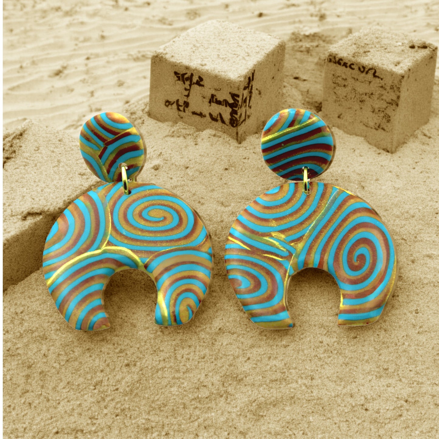 Inspired by ancient Egypt's fascination with symbolism, the Osiris Large Open Flat Edge Circle Earrings focus on the colours associated with the river, sun and heavens. Using a blend of opulent turquoise blue and variations of lustrous gold coloured polymer clay, unique and mesmerising patterns are formed making a captivating piece of wearable art. Finished with a high gloss resin, 304 stainless steel gold plated hypoallergenic posts and matching butterfly backs.
