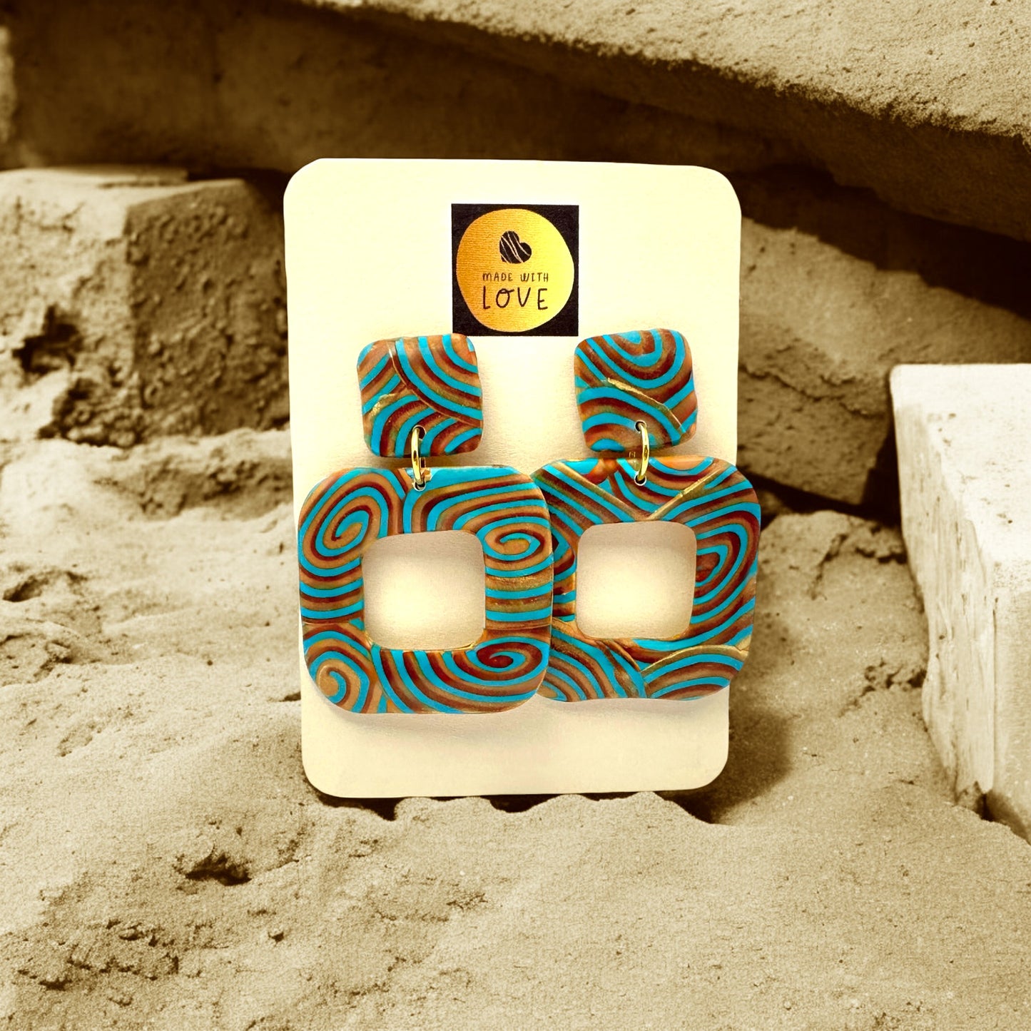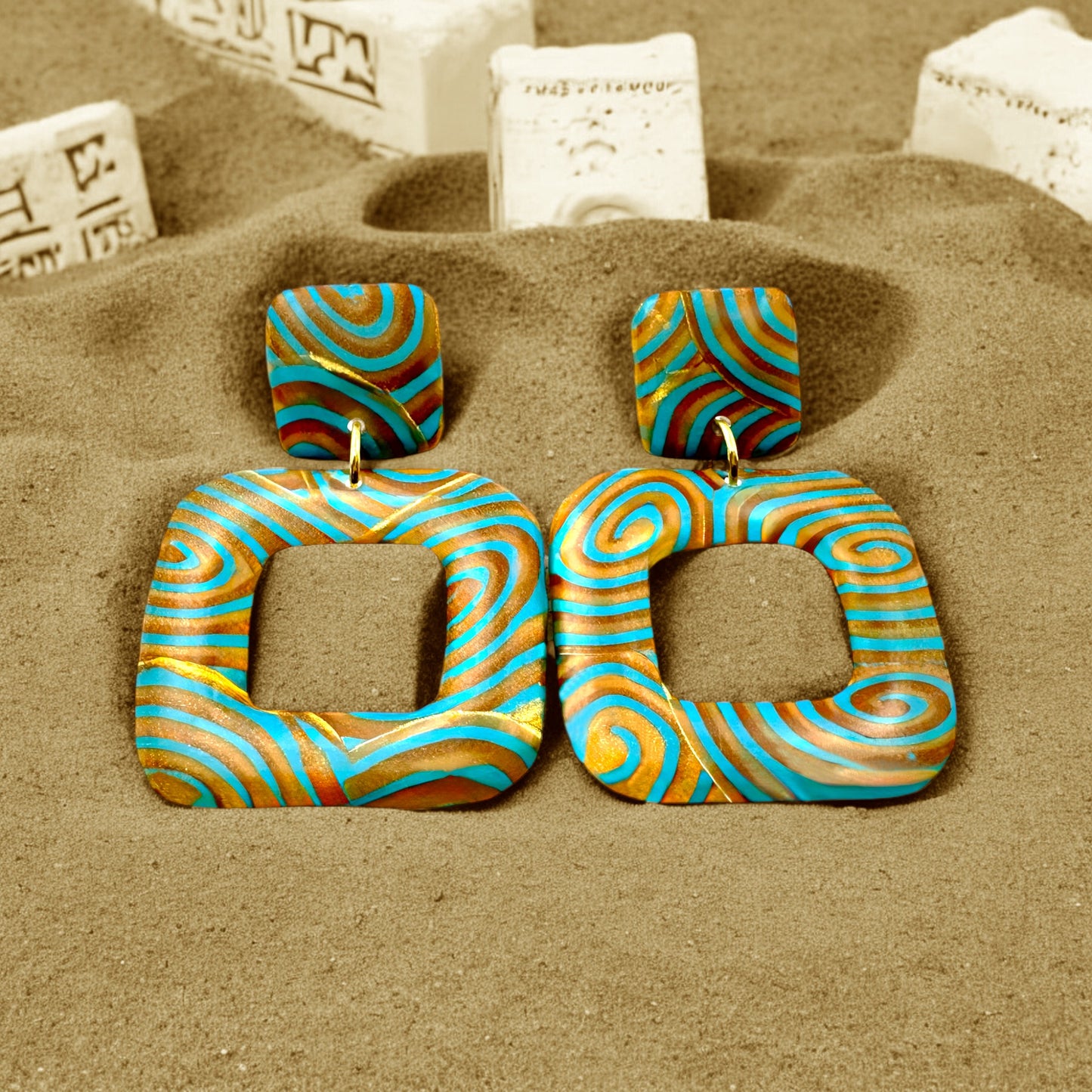 Inspired by ancient Egypt's fascination with symbolism, the Osiris Large Open Square Earrings focus on the colours associated with the river, sun and heavens. Using a blend of opulent turquoise blue and variations of lustrous gold coloured polymer clay, unique and mesmerising patterns are formed making a captivating piece of wearable art. Finished with a high gloss resin, 304 stainless steel gold plated hypoallergenic posts and matching butterfly backs.