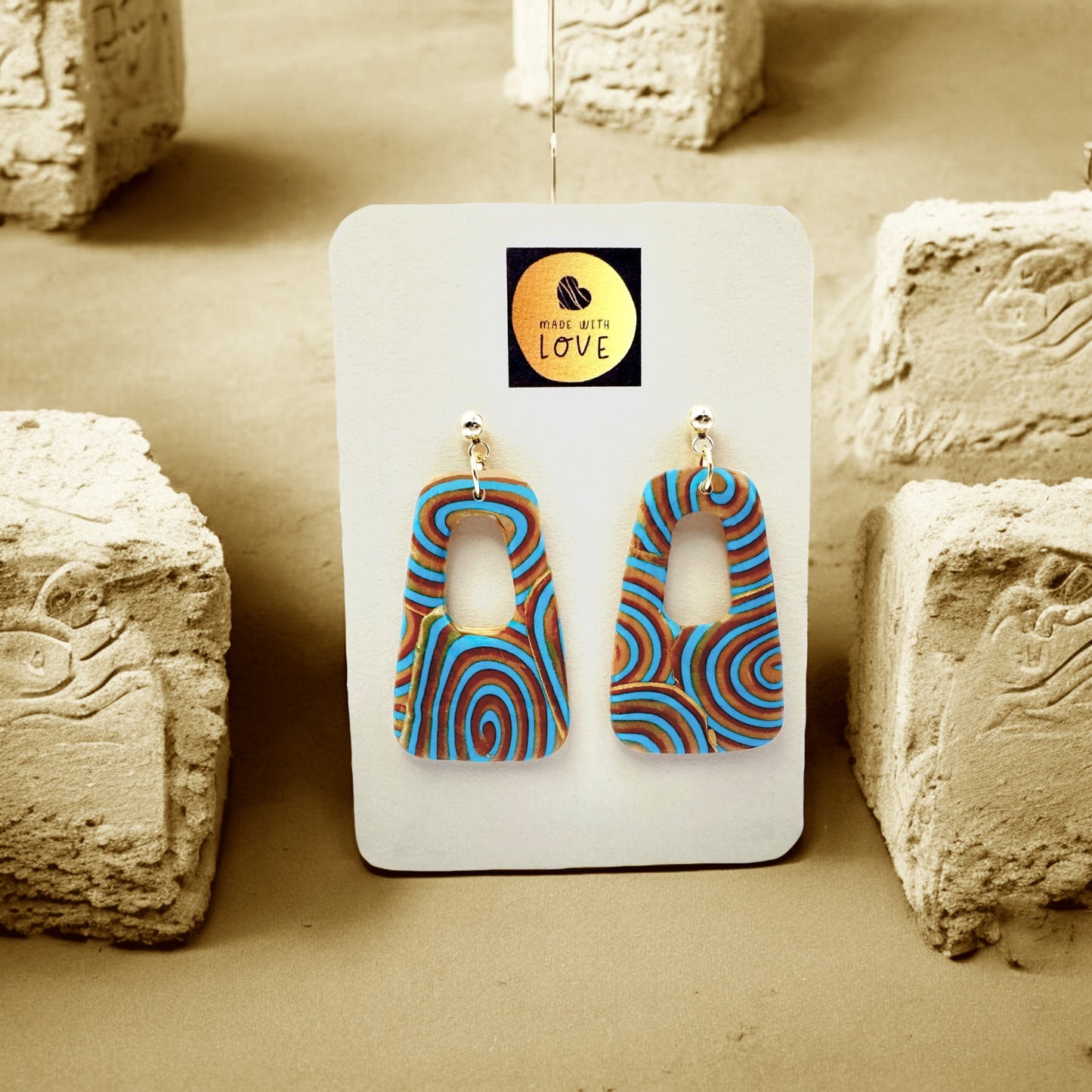 Inspired by ancient Egypt's fascination with symbolism, the Osiris Medium Freeform Open Oblong Earrings focus on the colours associated with the river, sun and heavens. Using a blend of opulent turquoise blue and variations of lustrous gold coloured polymer clay, unique and mesmerising patterns are formed making a captivating piece of wearable art. Finished with a high gloss resin, 304 stainless steel gold plated hypoallergenic ball stud posts and matching butterfly backs.