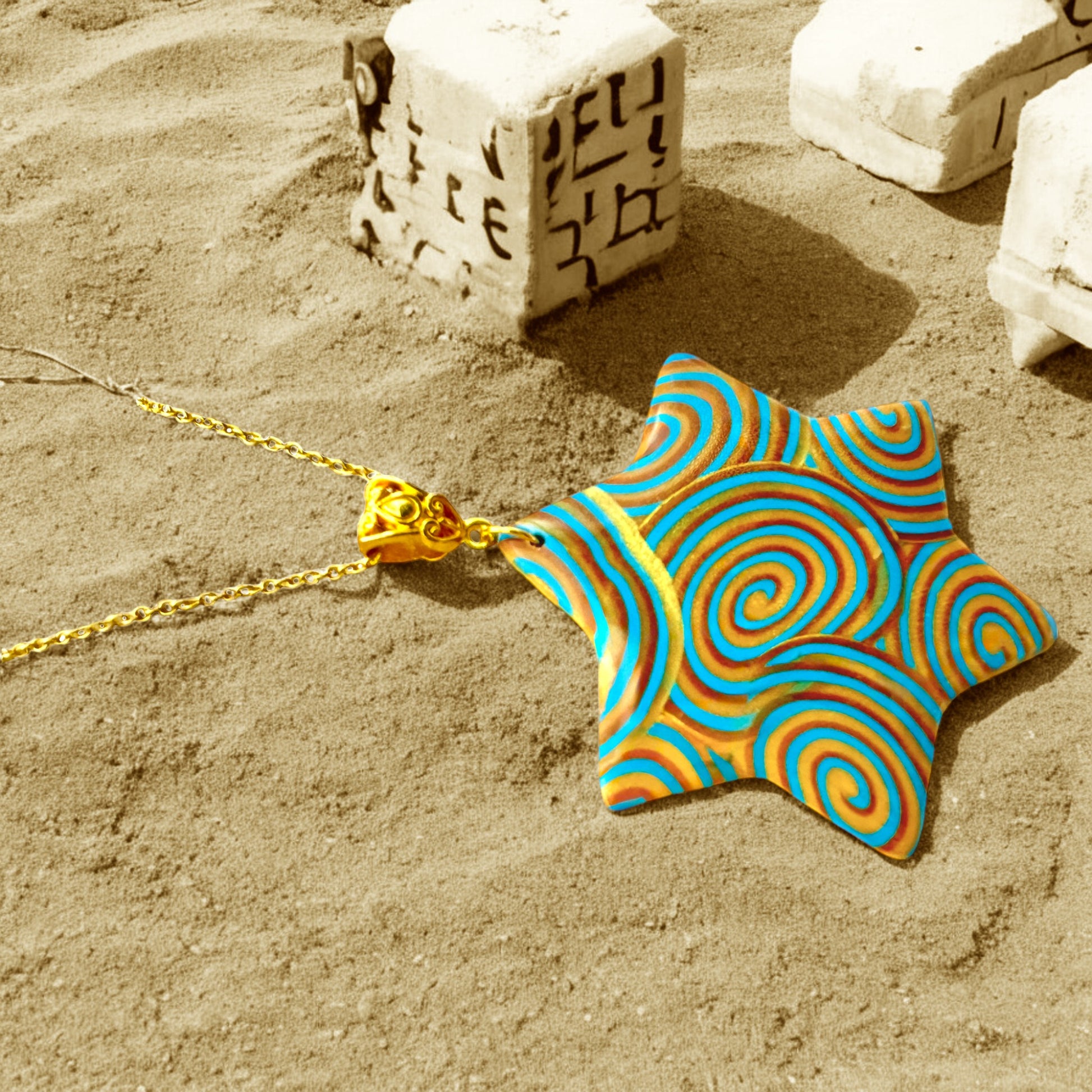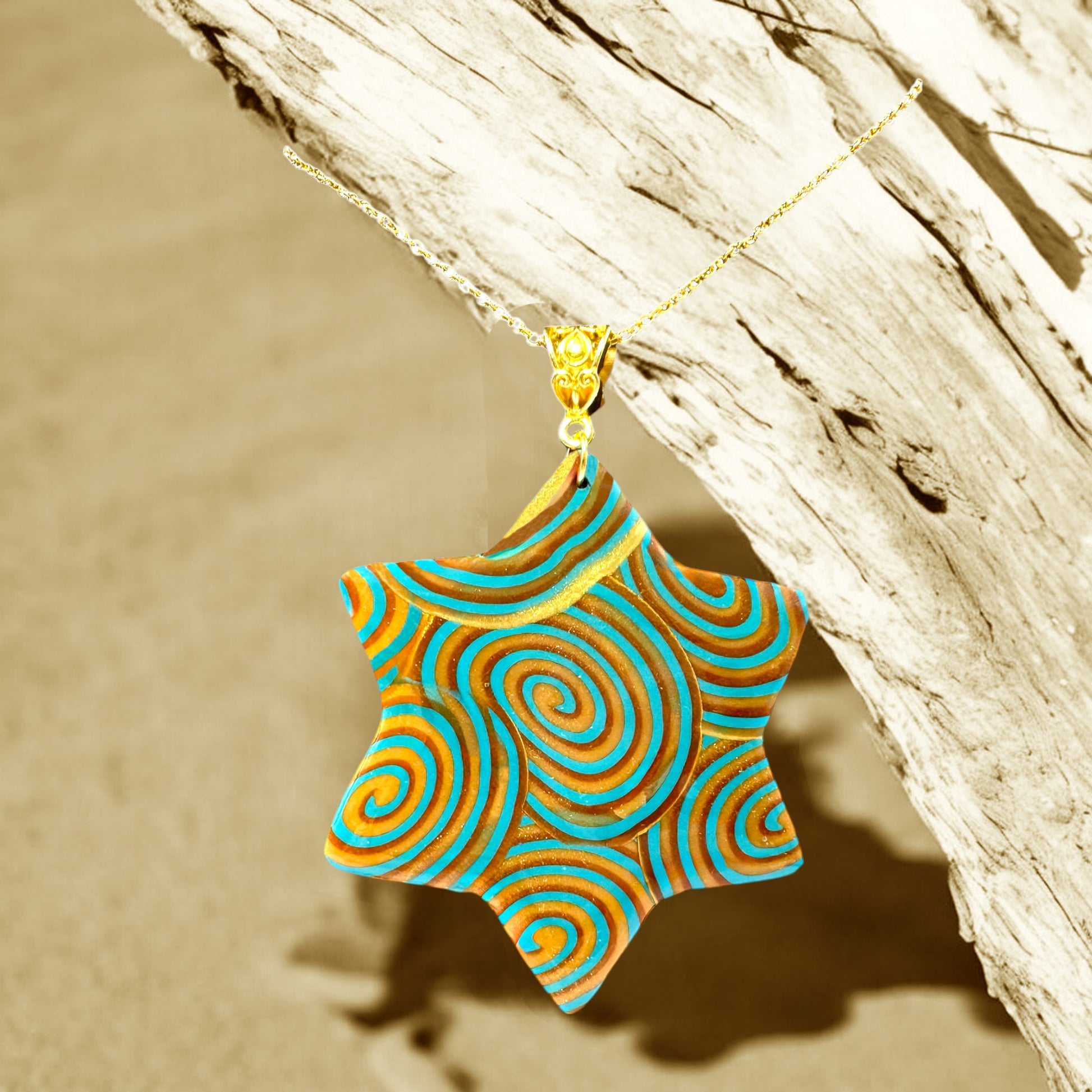 Inspired by ancient Egypt's fascination with symbolism, the Osiris Star Necklace focuses on the colours associated with the river, sun and heavens. Using a blend of opulent turquoise blue and variations of lustrous gold coloured polymer clay, unique and mesmerising patterns are formed making a captivating piece of wearable art. Finished with high gloss resin, a beautiful gold coloured patterned bail connects the 18 inch gold coloured chain which features a lobster claw clasp.