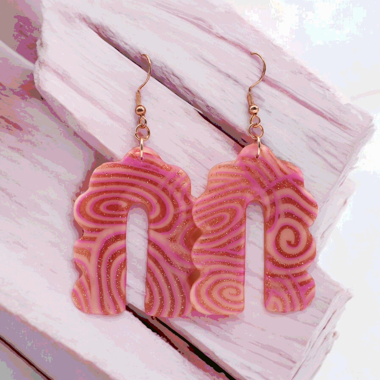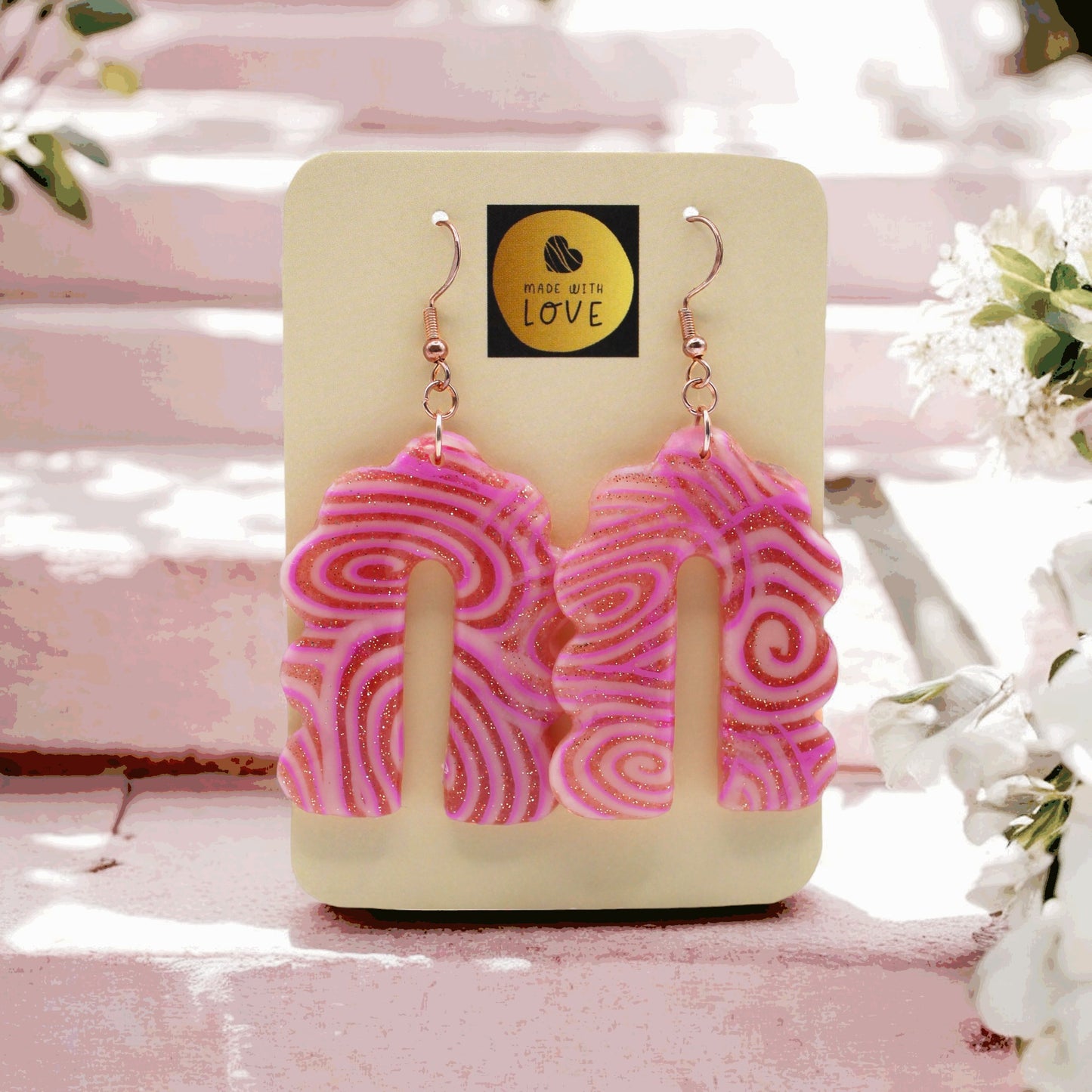 Cheers to the Pink Fizz Collectionđ„These bright and glitzy pieces have been handcrafted from polymer clay using a delicate palette of pinks and creamy ivory infused with a lustrous gold glitter. Made into a beautiful swirling pattern, this combination was mixed with and laid on translucent clay to create an ethereal 'see through' effect when catching light. Finished with a high gloss resin and 925 stainless steel rose gold plated hypoallergenic hooks.