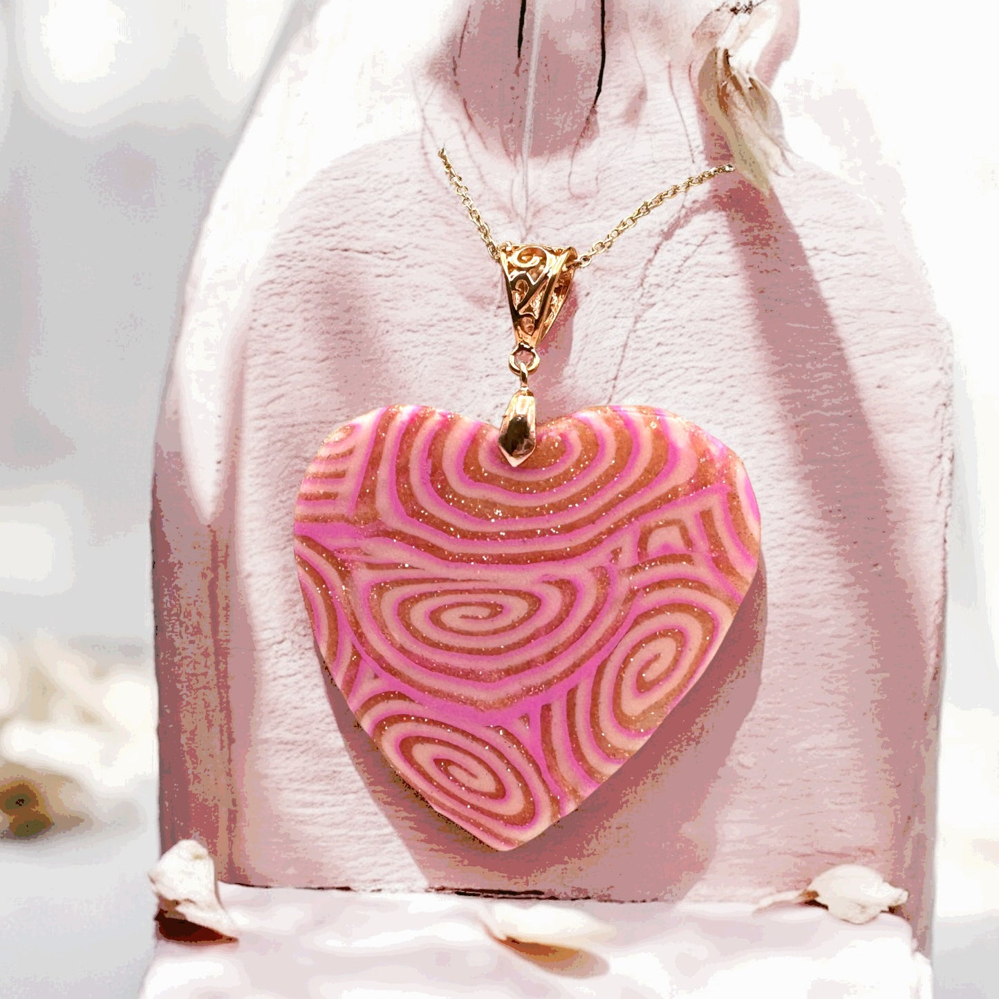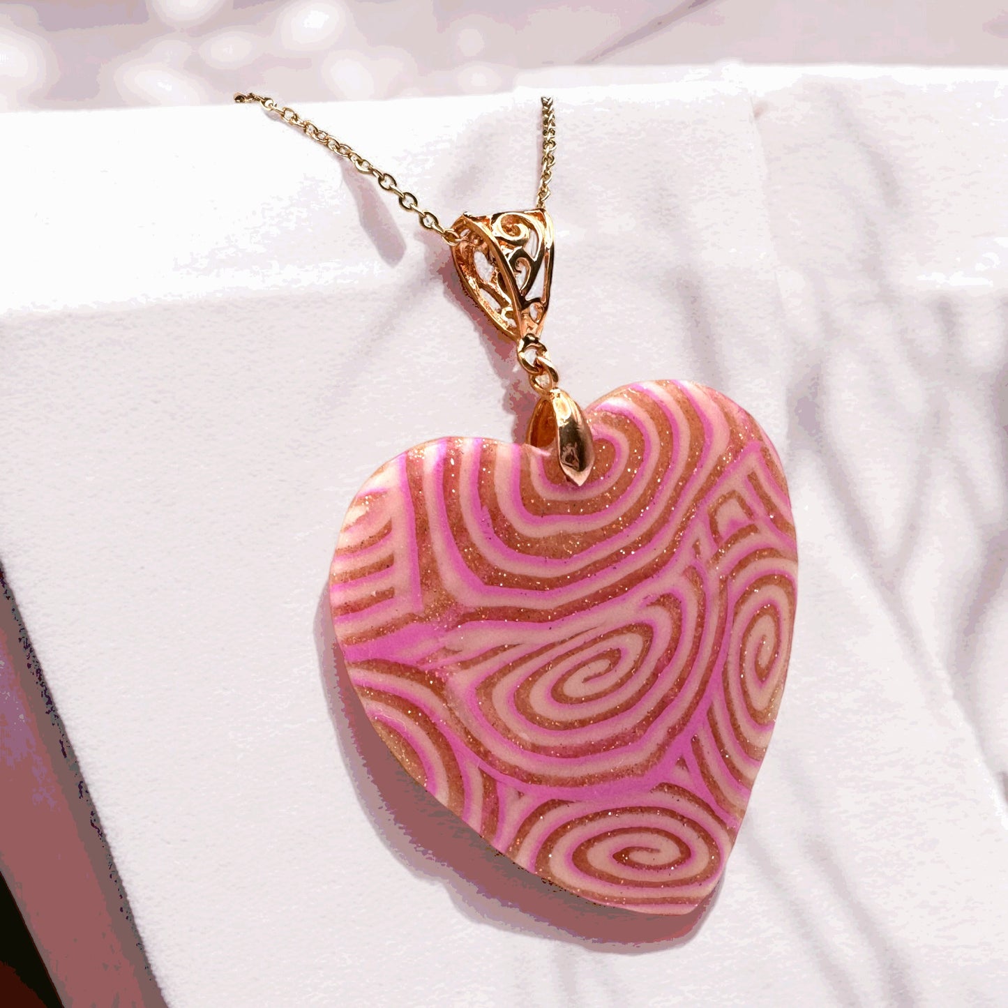 Cheers to the Pink Fizz Collectionđ„These bright and glitzy pieces have been handcrafted from polymer clay using a delicate palette of pinks and creamy ivory infused with a lustrous gold glitter. Made into a beautiful swirling pattern, this combination was mixed with and laid on translucent clay to create an ethereal 'see through' effect when catching light. Finished with a high gloss resin, a rose coloured bail connects to the 18 inch rose coloured chain which features a lobster claw clasp.