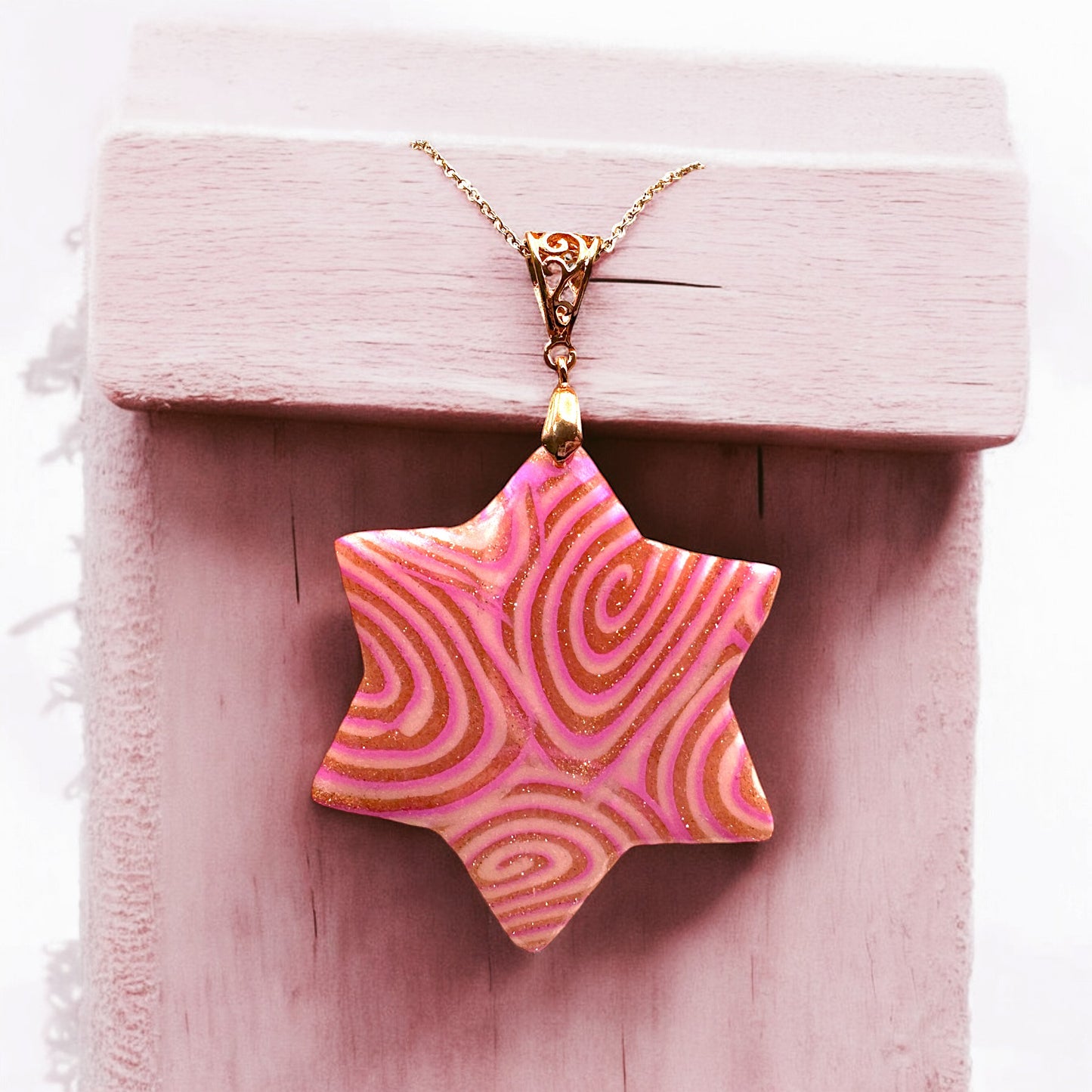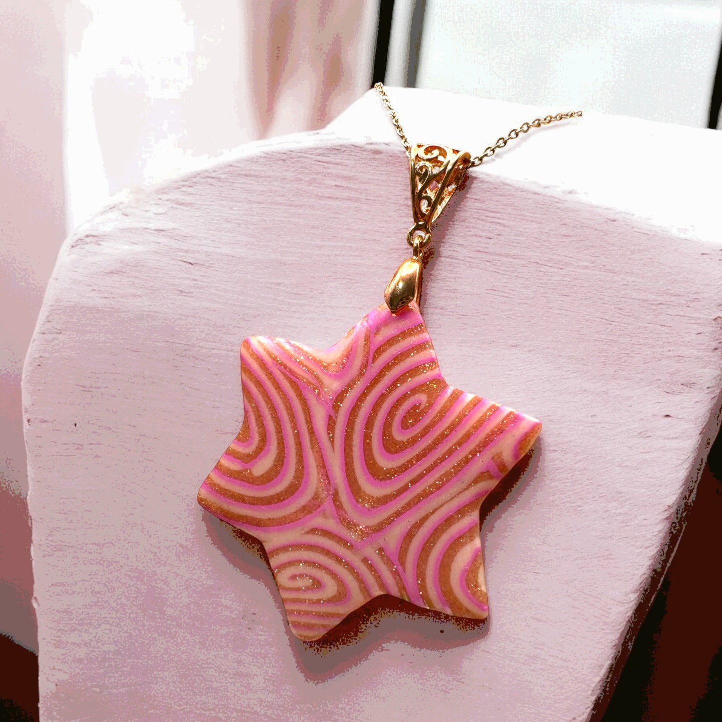 Cheers to the Pink Fizz Collectionđ„These bright and glitzy pieces have been handcrafted from polymer clay using a delicate palette of pinks and creamy ivory infused with a lustrous gold glitter. Made into a beautiful swirling pattern, this combination was mixed with and laid on translucent clay to create an ethereal 'see through' effect when catching light. Finished with a high gloss resin, a rose coloured bail connects to the 18 inch rose coloured chain which features a lobster claw clasp.