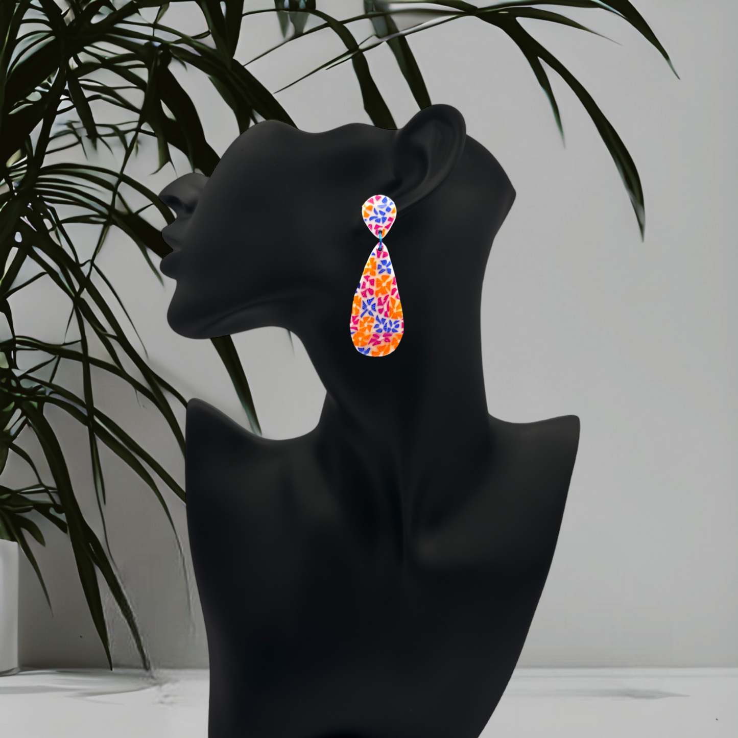 Make a bold style statement with the Tutti Frutti Large Double Teardrop Earrings! Handmade from Polymer Clay and totally unique in their ditsy patterned design, they feature three popping, mouth-watering vibrant colours; orange, blue and magenta. A high gloss resin finish, Silver Hypoallergenic earring posts with butterfly backings to match completes each piece. Glow up any look and turn heads wherever you go by adding this wearable art to your collection. Love, Love, Love 💖