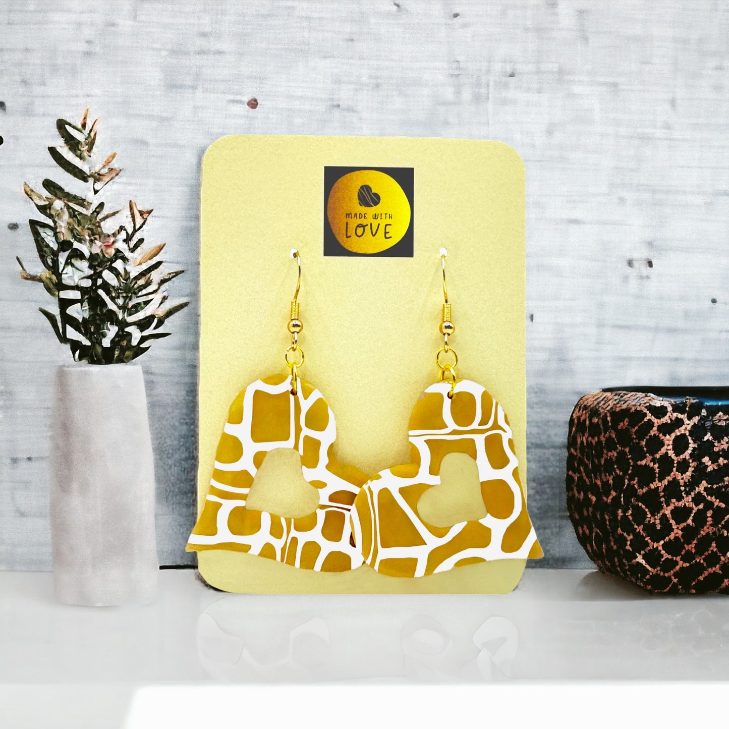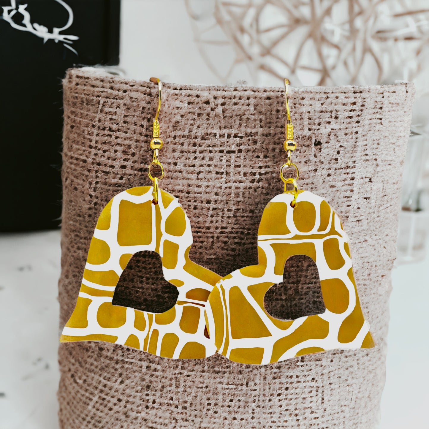 The name of this collection, Twiga Mkuu, Majestic Giraffe in Swahili is based on the natural origins of this beautiful wild animal, Africa. Handcrafted from polymer clay, these artful accessories blend the warm earthy tones of sandy beige and rich caramel with natural off-whites to evoke scenes of a warm savannah landscape in lands far away. Finished with a high gloss resin and 925 stainless steel gold plated hypoallergenic hooks.