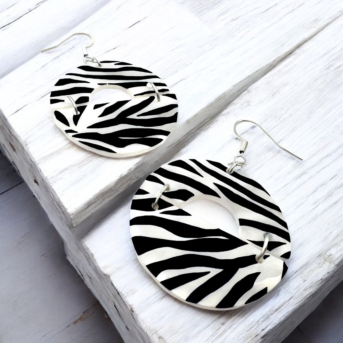 This bold Zebra Monochrome print is sure to add a touch of sass to your day! Made using polymer clay, the contrasting black and white stripes are applied using a silk screen method creating a mesmerizing visual impact, while the sleek lines and intricate details ensure a modern edge. Finished with a high gloss resin and 304 stainless steel hypoallergenic hooks.