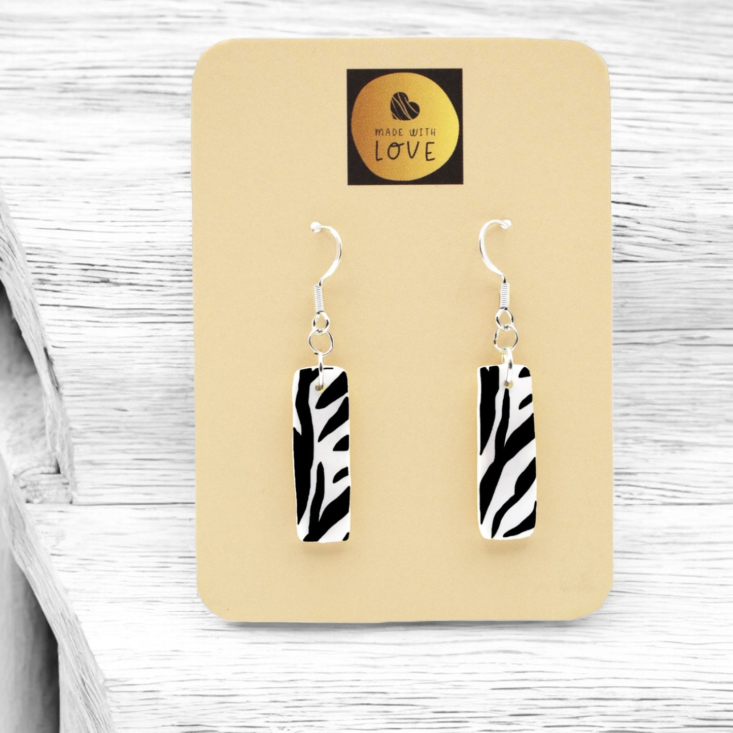 This bold Zebra Monochrome print is sure to add a touch of sass to your day! Made using polymer clay, the contrasting black and white stripes are applied using a silk screen method creating a mesmerizing visual impact, while the sleek lines and intricate details ensure a modern edge. Finished with a high gloss resin and 304 stainless steel hypoallergenic hooks.