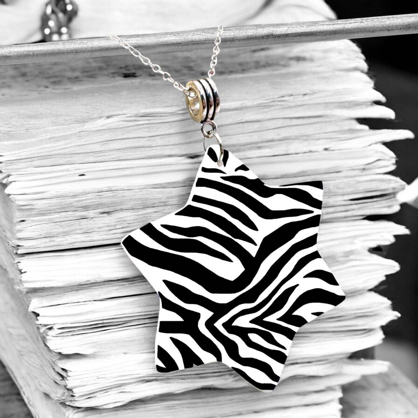 This bold Zebra Monochrome print is sure to add a touch of sass to your day! Made using polymer clay, the contrasting black and white stripes are applied using a silk screen method creating a mesmerizing visual impact, while the sleek lines and intricate details ensure a modern edge. Finished with a high gloss resin and and a silver coloured patterned bail connecting to an 18 inch silver colour chain which features a lobster claw clasp.
